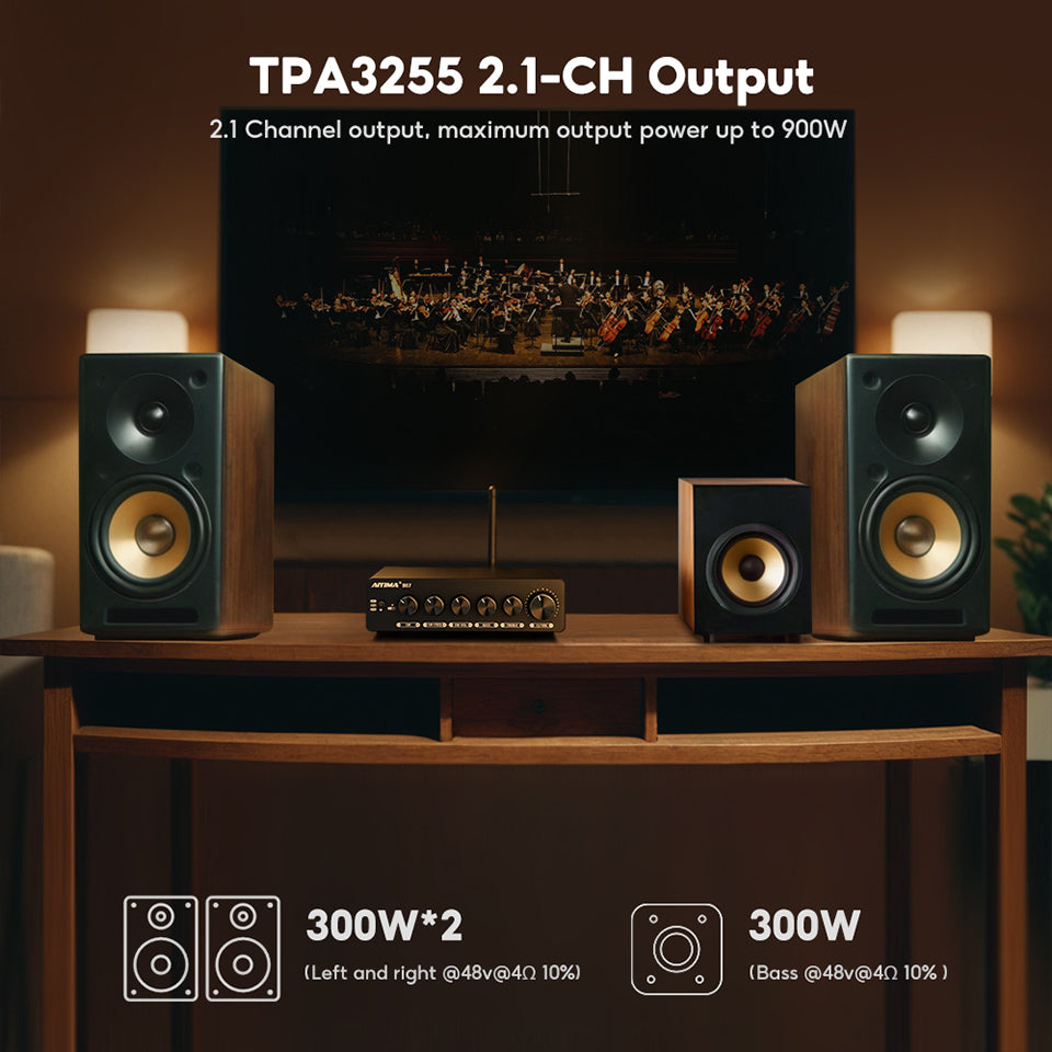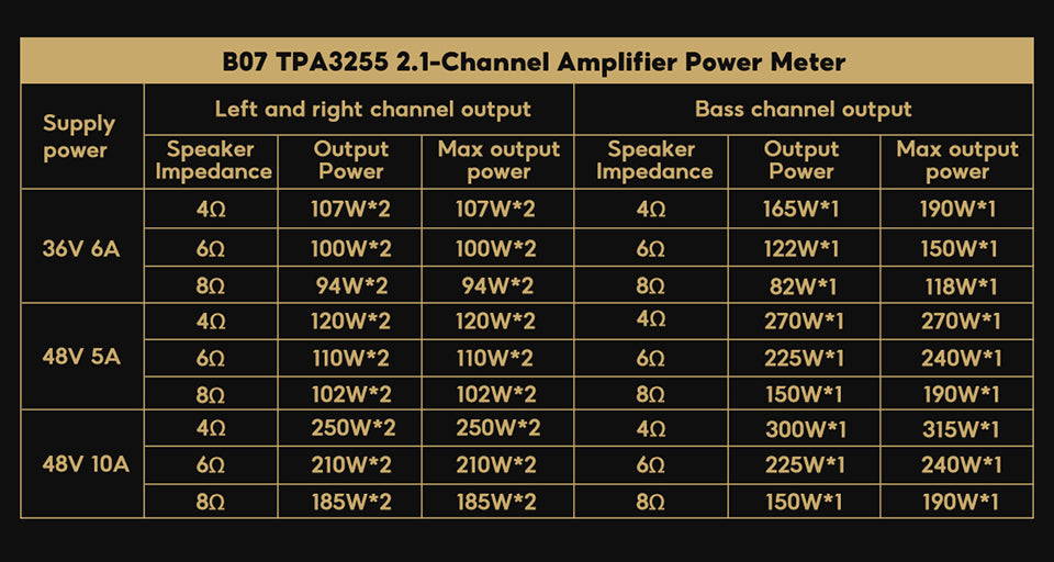 Output power: Left and right channels: 300w*2 at 48V 4Ohm Bass 300w 48V 4Ohm