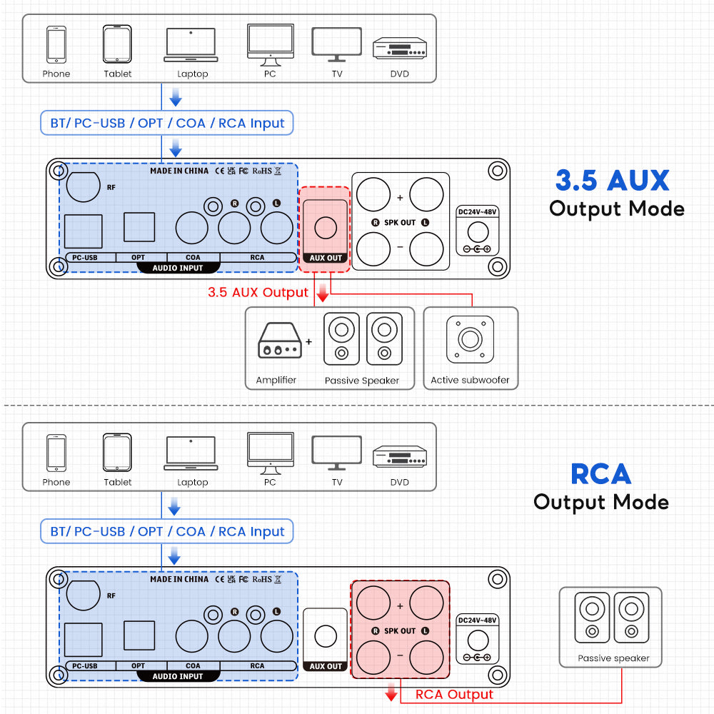 Audio output: SPK OUT(connect with passive speaker)+AUX OUT(connect with power amplifier or active speaker)